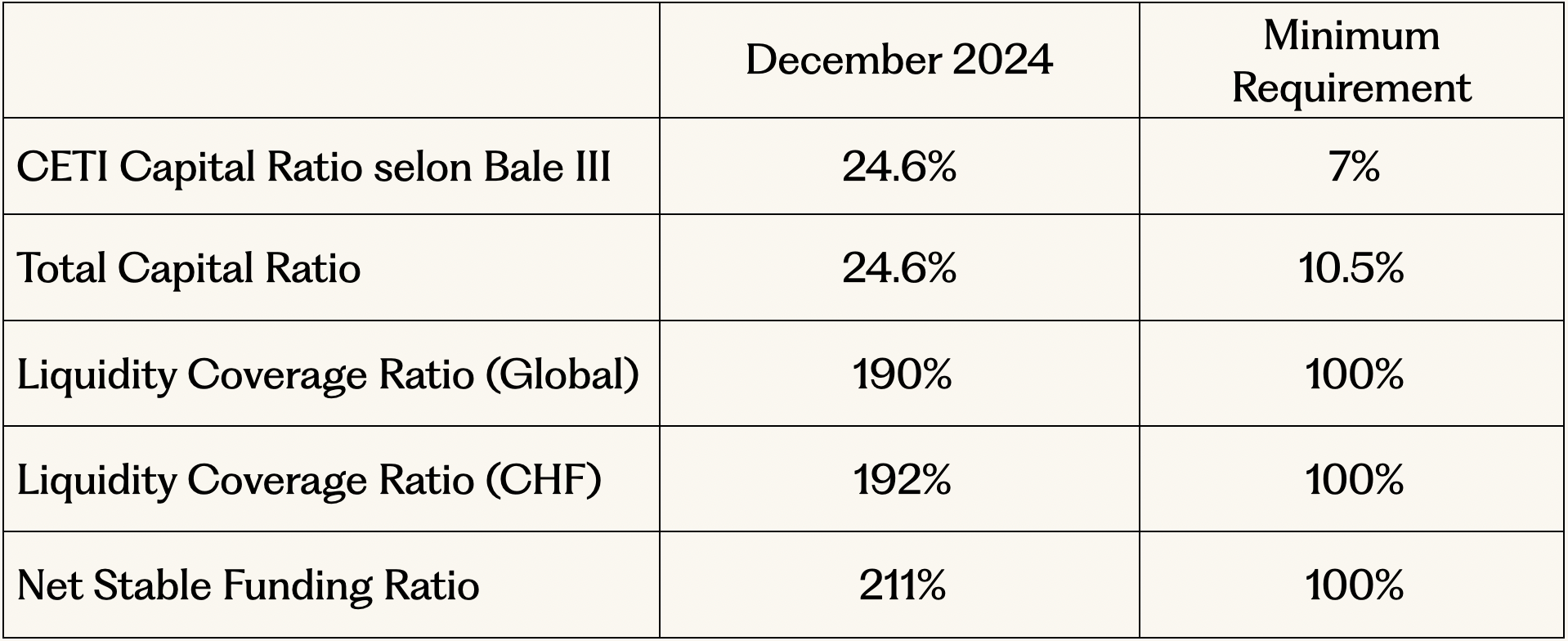 Banque Eric Sturdza is subject to regulatory oversight from the Swiss regulators, FINMA, it must also adhere to the international regulatory framework for banks, Basel Ill, which sets out minimum capital and liquidity standards. The bank exceeds all of these requirements.